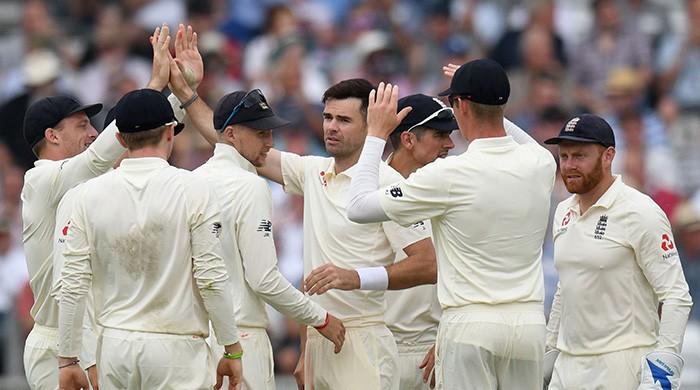 England´s James Anderson (C) celebrates with teammates after taking the wicket of Pakistan´s Pakistan´s Sarfraz Ahmed for 14 on the first day of the second Test cricket match between England and Pakistan at Headingley cricket ground in Leeds,...